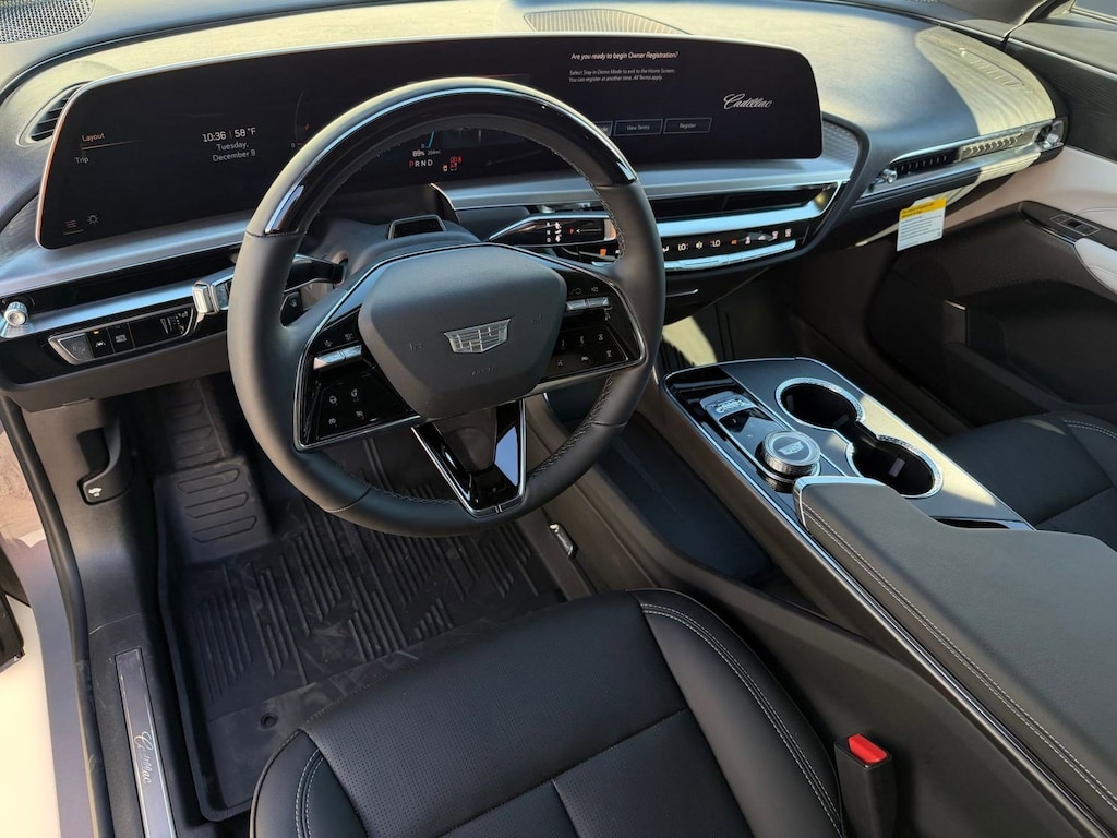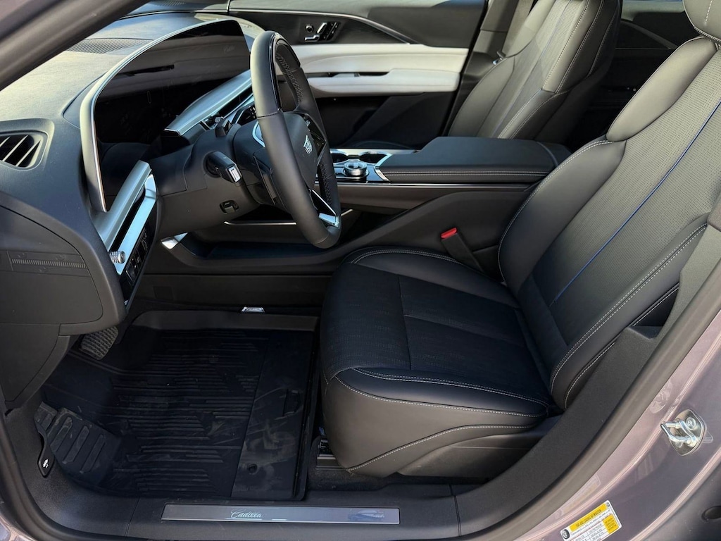 Visors, driver and front passenger illuminated vanity mirrors, Vehicle-to-home (V2H) all V2H-capable GM EV's can provide power to your properly equipped home in a blackout. (The GM Energy PowerShift Charger and GM Energy V2H Enablement Kit requires an adequately charged and properly equipped GM EV having bidirectional charging capabilities, a properly equipped home, and proper grid interconnection. Some eligible 24MY EVs will require a dealership or over-the-air update to enable bidirectional charging. Weather conditions, life of the battery, vehicle variation and usage, and other external factors may impact the duration of power supply. Power supply may be interrupted. It is not recommended that the following devices be powered with the GM Energy PowerShift Charger and V2H Enablement Kit: Medical Devices.), USB ports, type-C, (3) full-function front row, USB ports, type-C, (2) charge-only, rear, Universal Home Remote includes garage door opener, programmable, Transmission, none, Traction control, Tires, 265/50R20 all-season self-sealing, Theft-deterrent system, unauthorized entry, Tail lamps, LED, Suspension, front and rear 5-link with passive plus premium dampers, Super Cruise advanced driver assistance technology, for use on compatible roads. Includes 3 years of OnStar One with Super Cruise upgrade (Requires (UE1) OnStar and (R9M) 3 Years OnStar One. Always pay attention while driving and when using Super Cruise. Do not use a hand-held device. Requires active Super Cruise plan or trial. Terms apply. Visit cadillac.com/supercruise for compatible roads and full details. After initial 3-year period, OnStar Super Cruise plan must be purchased. Services vary by vehicle and model and require active service plan, working electrical system, cell reception and GPS signal. Does not include safety services; Super Cruise vehicles are connected to emergency services. See onstar.com for details and limitations.), Steering wheel, heated, Steering wheel, 3-spoke, Steering column, power tilt and telescoping, StabiliTrak, vehicle stability enhancement system, Spoiler, lower rear, illuminated, SiriusXM with 360L Trial Subscription. SiriusXM with 360L transforms your customers' ride with our most extensive and personalized radio experience on the road. (IMPORTANT: The SiriusXM trial subscription is not provided on vehicles that are ordered for Fleet Daily Rental ("FDR") use. Trial subscription is subject to the SiriusXM Customer Agreement and privacy policy, visit siriusxm.com which includes full terms and how to cancel. All fees, content, features, and availability are subject to change. Some features require GM connected vehicle services.), Sill plates, non-illuminated, front door, Side Bicyclist Alert.