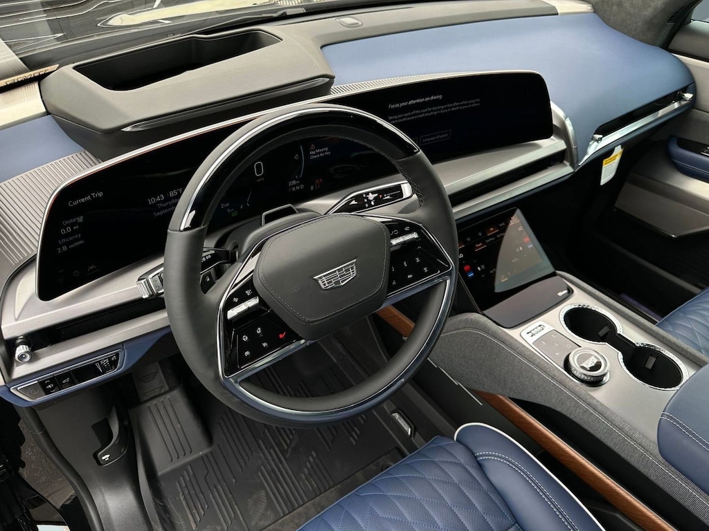 Universal Home Remote, Transmission, none (electric drive unit), Trailering provisions includes 4-wire electrical harness and 4-pin sealed connector, Traffic Sign Recognition, Tires, 295/40R22 all-season, self-sealing, Theft-deterrent system, unauthorized entry, Theft-deterrent alarm system, content theft alarm, Tail lamps, LED with lighting choreography, Suspension, Air Ride Adaptive, adjustable, Super Cruise advanced driver assistance technology, for use on compatible roads. Includes 3 years of OnStar One with Super Cruise upgrade (Requires (UE1) OnStar and (R9M) 3 Years OnStar One. Always pay attention while driving and when using Super Cruise. Do not use a hand-held device. Requires active Super Cruise plan or trial. Terms apply. Visit cadillac.com/supercruise for compatible roads and full details. After initial 3-year period, OnStar Super Cruise plan must be purchased. Services vary by vehicle and model and require active service plan, working electrical system, cell reception and GPS signal. Does not include safety services; Super Cruise vehicles are connected to emergency services. See onstar.com for details and limitations.), Sueded microfiber headliner and trim, Steering wheel, wrapped, 2-spoke, Steering wheel, heated, automatic, Steering column, power tilt and telescoping, SiriusXM with 360L Trial Subscription. SiriusXM with 360L transforms your customers' ride with our most extensive and personalized radio experience on the road. (IMPORTANT: The SiriusXM trial subscription is not provided on vehicles that are ordered for Fleet Daily Rental ("FDR") use. Trial subscription is subject to the SiriusXM Customer Agreement and privacy policy, visit siriusxm.com which includes full terms and how to cancel. All fees, content, features, and availability are subject to change. Some features require GM connected vehicle services.), Sill plates, illuminated, front and rear, Side Bicyclist Alert, Sensor, vehicle interior movement, Sensor, vehicle inclination, Sensor, air quality indicator.